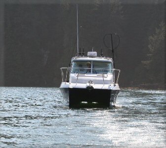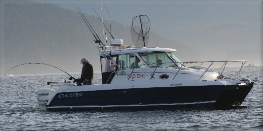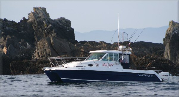 This is Bad dog, a 2008 26 foot Glacier Bay Catamaran. It is one of the smoothest riding and most stable boats on the West coast of Vancouver Island. It comfortably seats four guests, has a head, reliable twin Evenrude E tech motors, heater, full electronics and more. Everything on this boat is top of the line and built for comfort so when the weather changes you will be glad that you are on the Bad dog.